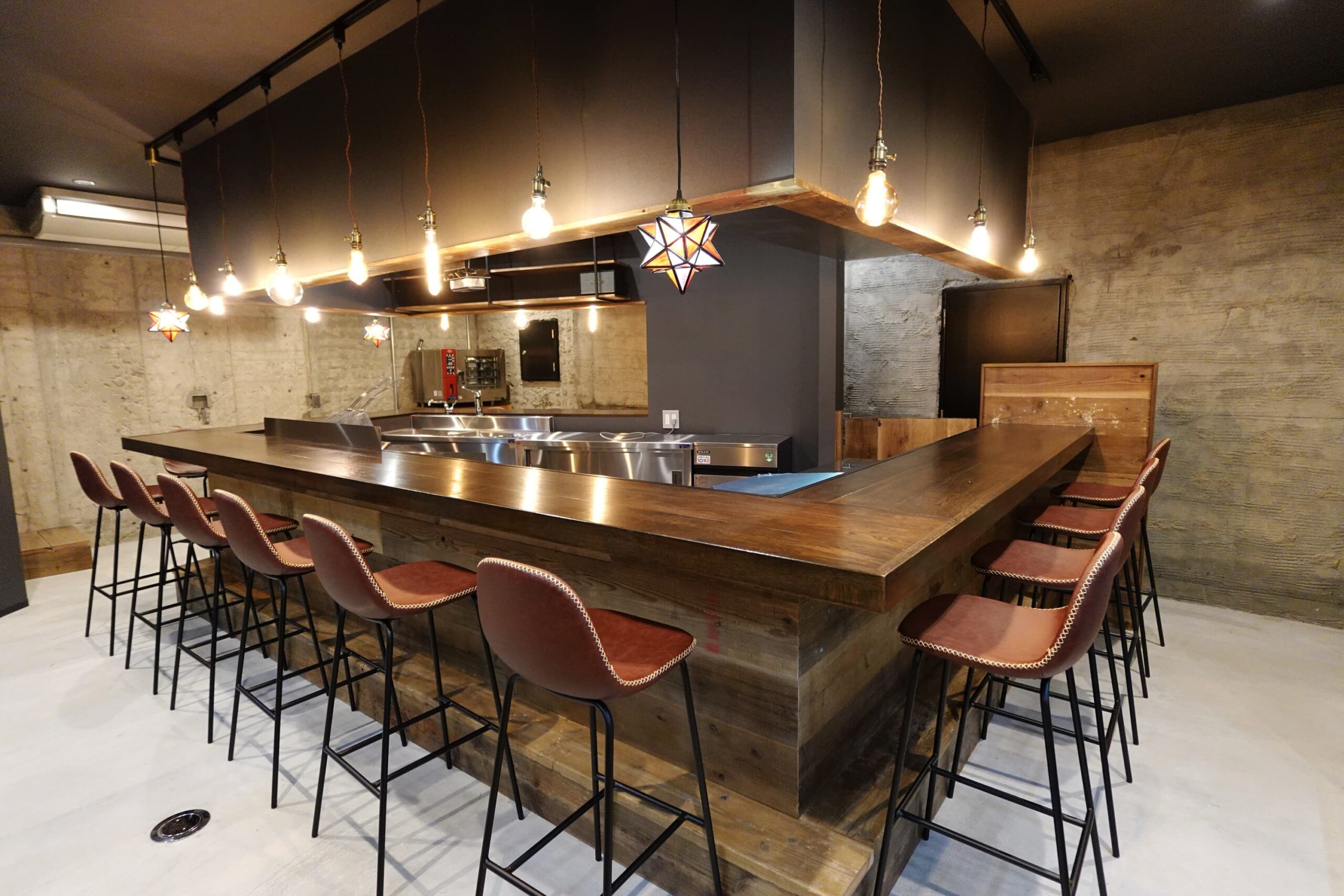 床はモルタル金鏝仕上げ、既存のゴツゴツした躯体壁はコーティング塗料を何度も塗って仕上げました。